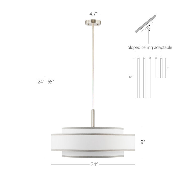 Complete your modern décor with this 5-light cylindrical chandelier. We love the striped look of the concentric shades that add dimension and visual appeal. It features a ceiling-compatible, angled canopy, a height-adjustable seat, and an iron fixture. The five standard bulbs (sold separately) are installed behind white linen shades, which gently diffuse light throughout your space. If you prefer an even softer light, this fixture is dimmer-compatible. The simple, lightweight look of this chandelier makes it an easy choice for a kitchen, living room, or bedroom. Assembly required.