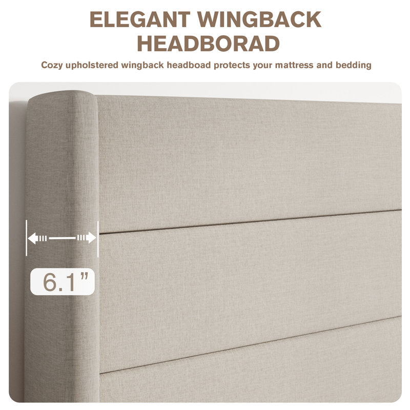 With its sleek, modern style, this upholstered platform bed features a hydraulically lifting frame that reveals storage compartments for seasonal clothing and other items you wish to keep out of sight. Crafted from solid and engineered wood, it sits flush with the floor and is upholstered in your choice of fabric. A horizontally grooved headboard with a subtle wingback design completes the look. Multiple center slats provide support for your mattress (sold separately). No box spring is required.