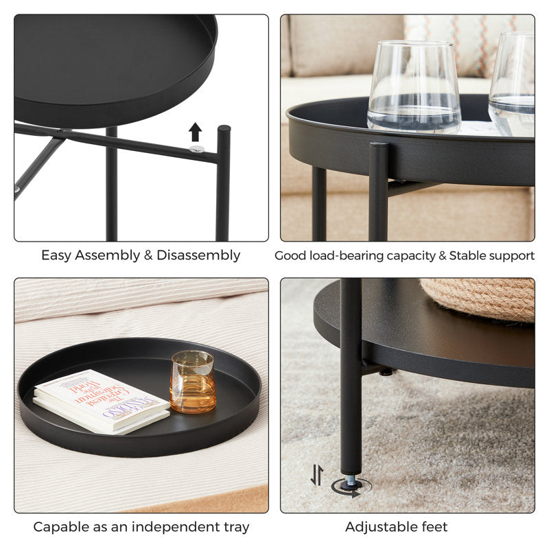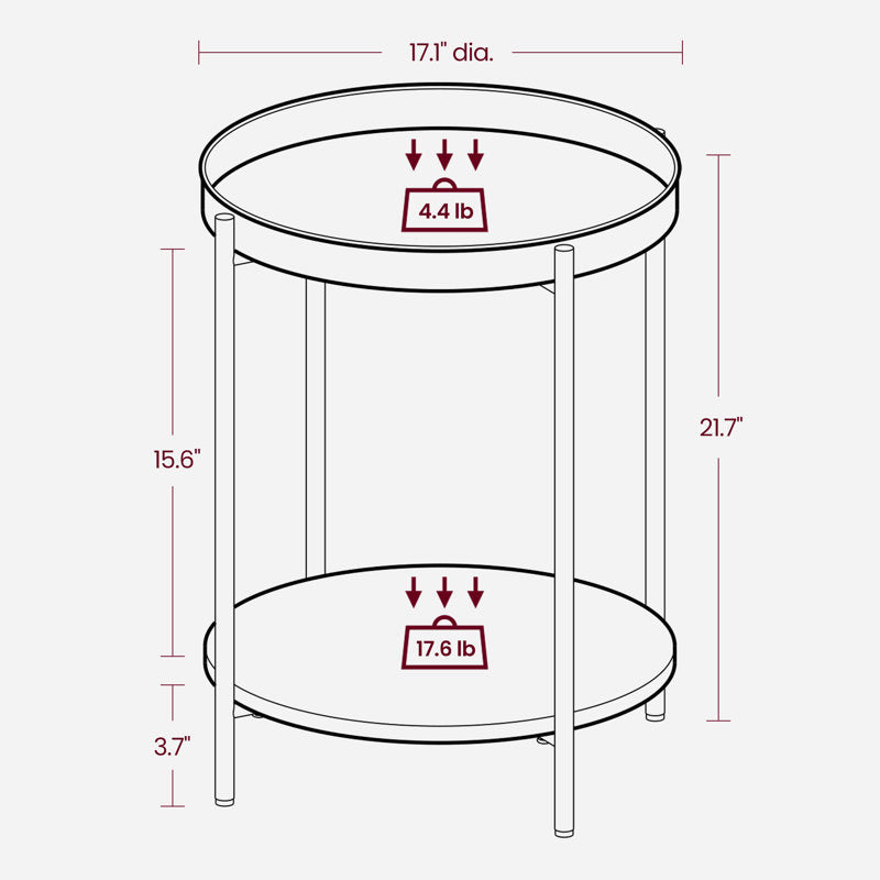 This round-end table gives you multiple platforms for storage and display. The base and tray-style top are crafted from powder-coated steel, while the lower shelf is made from engineered wood. We love that the tabletop is removable, so you can easily transport daily essentials from room to room. Keep a stack of books underneath, so they're at the ready whenever you need them. With a diameter measuring approximately 17", this table has a small footprint that fits nicely beside a living room sofa or an armchair in your den.