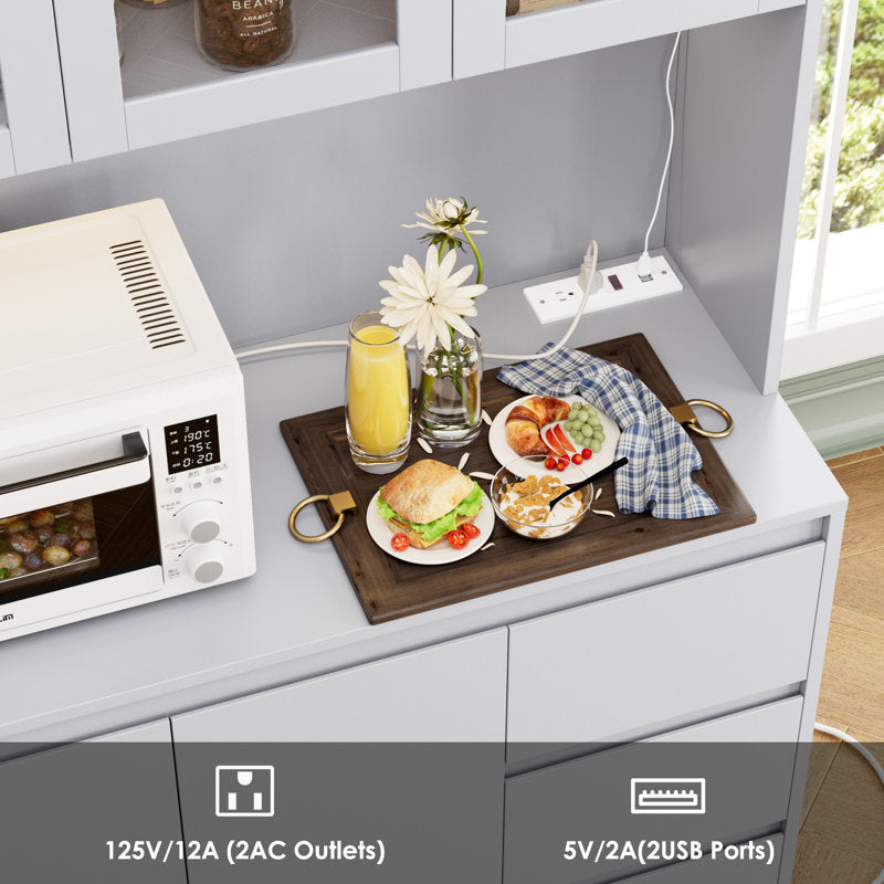 Looking for a stylish kitchen cabinet for your home? This cabinet features three closed cabinets, three drawers, and an open countertop. The tempered glass top with a clear frame complements both your kitchen and dining room. Feel free to place small kitchen appliances like microwaves, coffee makers, and toasters on the open countertop! Additionally, the microwave countertop is equipped with LED lights for added convenience when using your microwave and coffee maker. It also includes two standard AC power outlets and USB ports to power your coffee makers and microwaves.