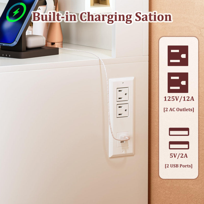 Elevate your beauty routine with our upgraded makeup vanity, combining sleek design with smart functionality. The premium HD rectangular mirror offers a crystal-clear reflection, complemented by a spacious floating shelf for quick access to essentials. Customizable LED lighting includes three color modes and adjustable brightness for perfect illumination. Stay connected with the integrated power strip that charges multiple devices simultaneously. Nine roomy drawers provide exceptional storage for cosmetics and accessories. Designed for modern lifestyles, this vanity transforms everyday rituals into luxurious experiences with its perfect balance of style, innovation, and organization—your ultimate beauty command center.