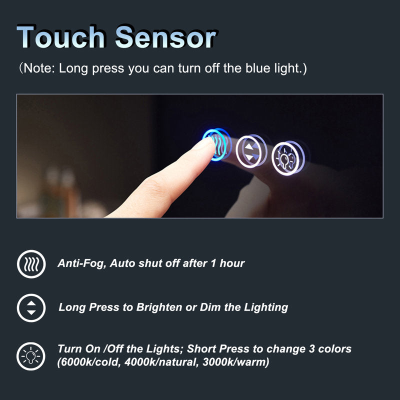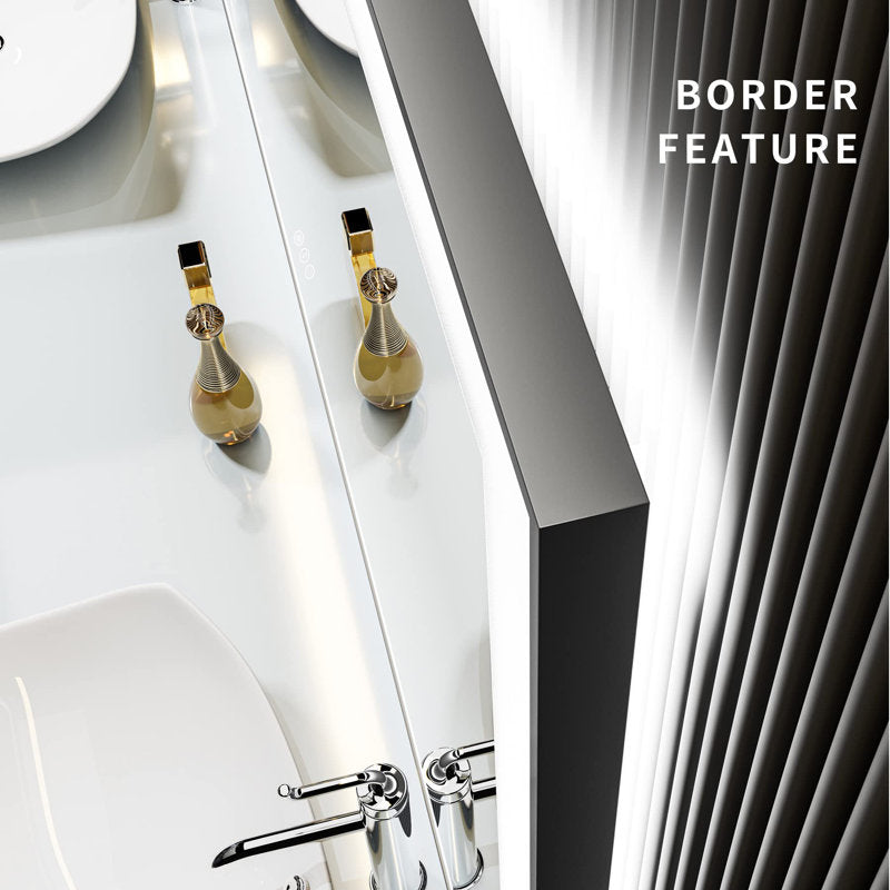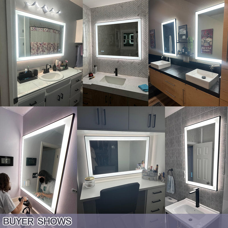 Enhance your bathroom with this framed . It features a super-bright 24-volt output strip with over 192 LEDs per meter (compared to other low-power 12-volt strips that aren't bright enough). The mirror boasts a durable, high-strength aluminum frame and tempered glass (virtually unbreakable). Three color temperatures, adjustable brightness, and an anti-fog design cater to your smart needs. The sleek, sturdy frame complements various decorating styles (modern, glamorous, industrial, country, rustic, etc.) and is suitable for a range of spaces (bathroom, living room, bedroom, dressing room, hallway, corridor, etc.), adding beauty to any room. Features include: 3 color temperatures (6000K/cool, 4000K/natural, 3000K/warm); adjustable brightness (10% to 100%); and a memory function (supports a wall switch). Anti-fog function and automatic one-hour delayed shut-off; Space aluminum structure and powder coating process; Damage-free tempered glass; Horizontal and vertical mounting; Plug/wired; ETL certification and 3-year warranty.
