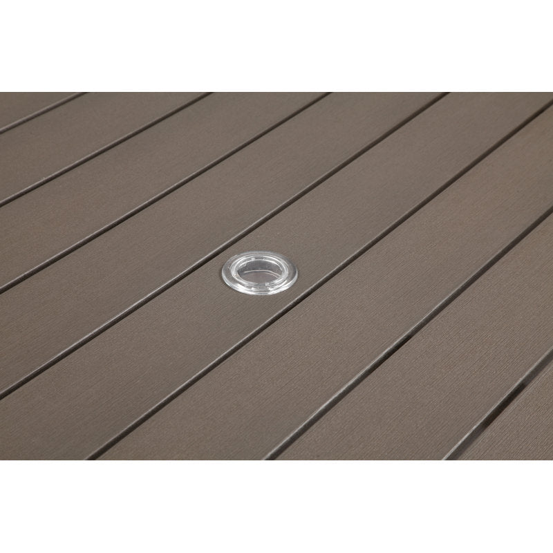 This outdoor dining table is your go-to spot for alfresco meals with family and friends. Its rectangular shape comfortably seats up to six, making it ideal for gatherings. Crafted with a metal frame and aluminum inner structure, it's designed to withstand the elements. The slatted acrylic tabletop features an umbrella hole, so you can enjoy shade on sunny days. With its water-, UV-, and rust-resistant properties, this table is built for outdoor enjoyment. To keep it looking fresh, simply clean with hot water or steam.