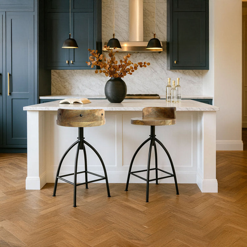 Offering a comfortable seating experience, this counter-height stool is everything a stylish interior deserves. The seat of this counter stool is made of washed mango wood with a matte finish, which is attached to a sturdy metal base. This stool features a saddle-style seat, making it a perfect adjustable option. Its construction involves the efficient use of powder-coated wood and metal on an iron base. The metal base also includes a footrest, allowing you to sit in a relaxed position. This stool is perfect for placing near your kitchen or at your living room bar. Explore our collection of pia stools for more size options.