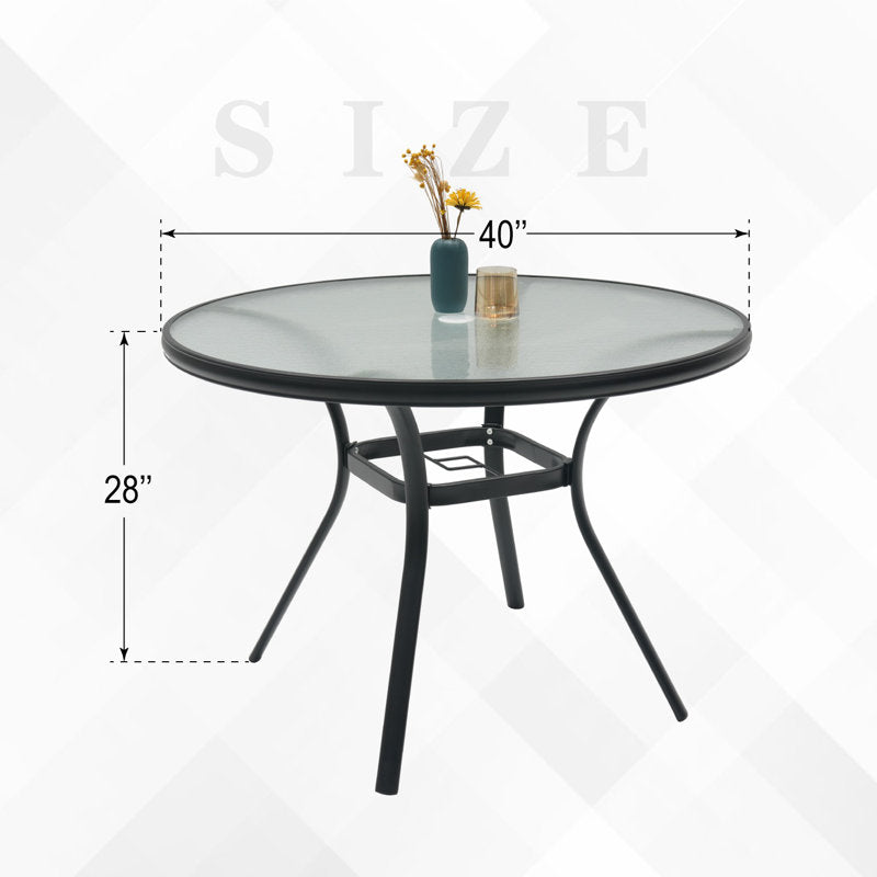 Basic, essential, and timeless, this affordable outdoor dining table sets frosted tempered glass within a sturdy, styled metal frame. Pair with our dining chairs for an enjoyable leisure experience.