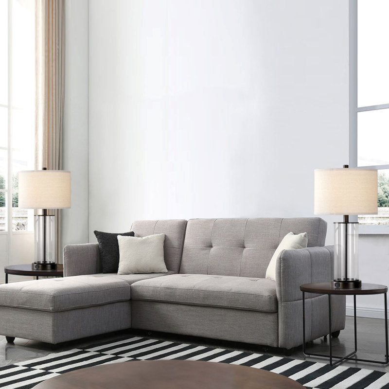 The striking silhouette is expertly handcrafted from blown glass, its tall cylinder revealing a sleek, modern stem. A cream-colored linen shade provides tonal beauty, while the black, water-based finial, neck, and base beautifully highlight the clear glass and add a touch of glamour. Touch anywhere on the metal base to adjust the light's brightness to three levels. Equipped with two USB ports and an AC outlet, it keeps your smartphones, laptops, tablets, and other electronic devices charged even when the light is off. This modern table lamp is suitable for your bedroom, living room, or any other space.